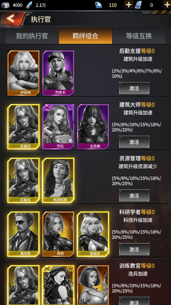 6、游戏内还有许多强大的执行官,他们之间还会有相应的羁绊,同时上场可以为避难所来带不小的提升。